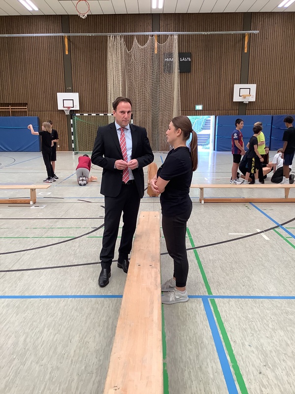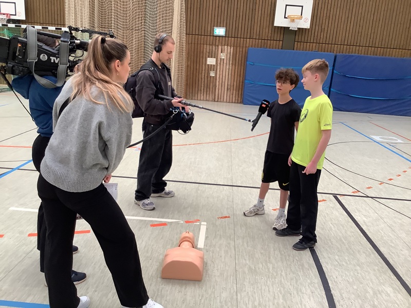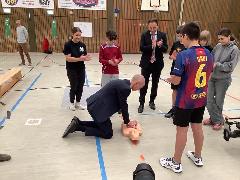 Im Anschluss besuchten die Gäste den Unterricht in der Sporthalle, der von Frau Rebekka Pauly durchgeführt wurde. Dort zeigten die Schülerinnen und Schüler eindrucksvoll, wie eine Reanimation funktioniert – prüfen, rufen, drücken – und dass sie die wichtigsten Handgriffe sicher beherrschen.