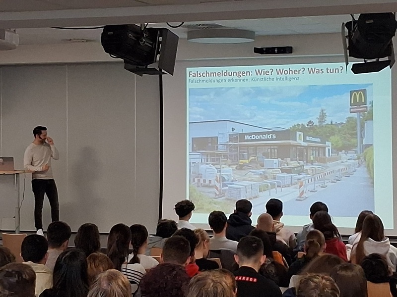 Bereits in der Doppelstunde vor dem Vortrag hatten sich die Klassen intensiv mit dem Thema auseinandergesetzt. Im Mittelpunkt stand die Frage: Sind Fake News und Deep-Fake-Videos ein harmloser Spaß oder eine ernstzunehmende Gefahr? Ziel war es, die Sensibilität für manipulative Inhalte zu schärfen und das eigene Urteilsvermögen hinsichtlich der Vertrauenswürdigkeit von Quellen zu stärken.